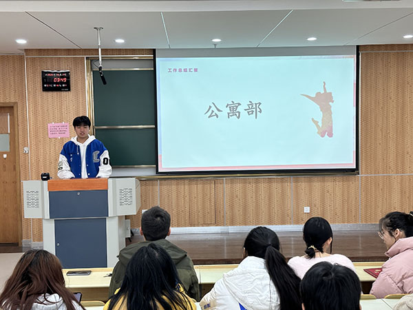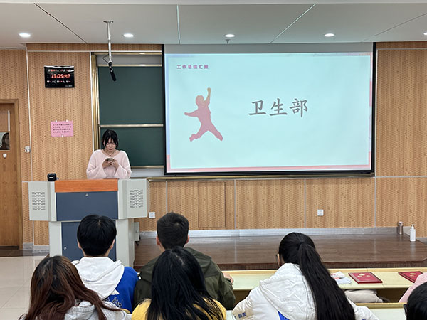 各部门的干部对本学期的工作成果以演讲的形式进行了展示:秘书处主办了“谨记安全 共建和谐校园”安全知识竞赛,增强了广大学生的安全防范意识与自我保护意识;学风、公寓和卫生三部门负责人分别从部门自身特点,对各自部门本学期工作情况作了简短的演讲汇报。当然,任何工作的展开都有不足的一面,各部门对工作中产生的问题进行了反思和讨论。大家都表示在今后的工作中,在着眼大局的同时,要更加注重细节。